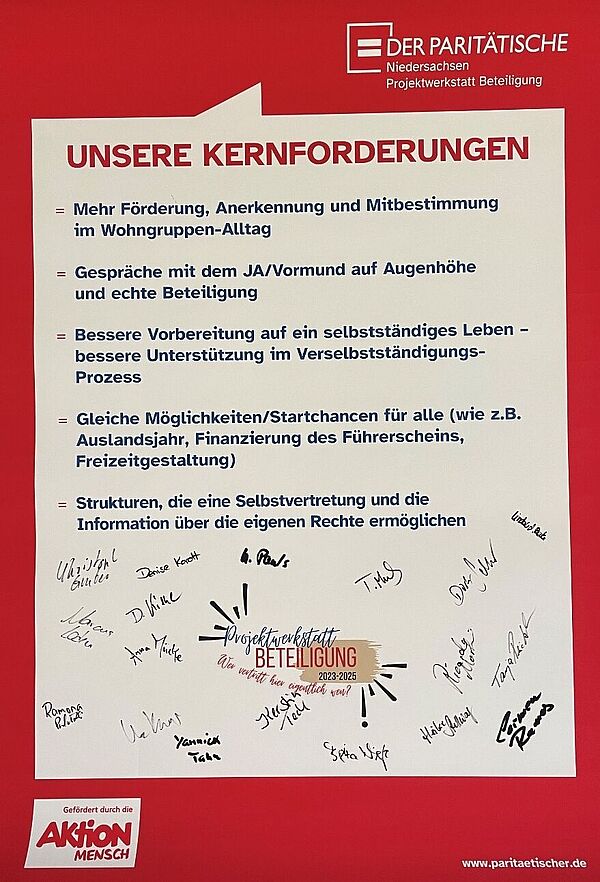 In Niedersachsen sind diese Fragen im Kontext der Hilfen zur Erziehung, Pflegefamilien und Erziehungsstellen nicht einfach zu beantworten. Deshalb haben wir 2023 die Projektwerkstatt ins Leben gerufen, die sich an junge Menschen ab 14 Jahren in stationären Hilfen zur Erziehung, Pflegefamilien und Erziehungsstellen, richtet. Das Projekt wird von Aktion Mensch gefördert.