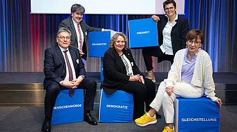 Digitalisierung braucht Investitionen, verlässliche Rahmenbedingungen und politische Weitsicht. Von links vorn: Staatssekretär Prof. Joachim Schachtner, Vorsitzende des Paritätischen Niedersachsen Kerstin Tack und Staatssekretärin Dr. Christine Arbogast. Von links hinten: Prof. Dr.-Ing. Dietmar Wolff, Hochschule Hof, und Digitalisierungsstaatssekretärin Anke Pörksen