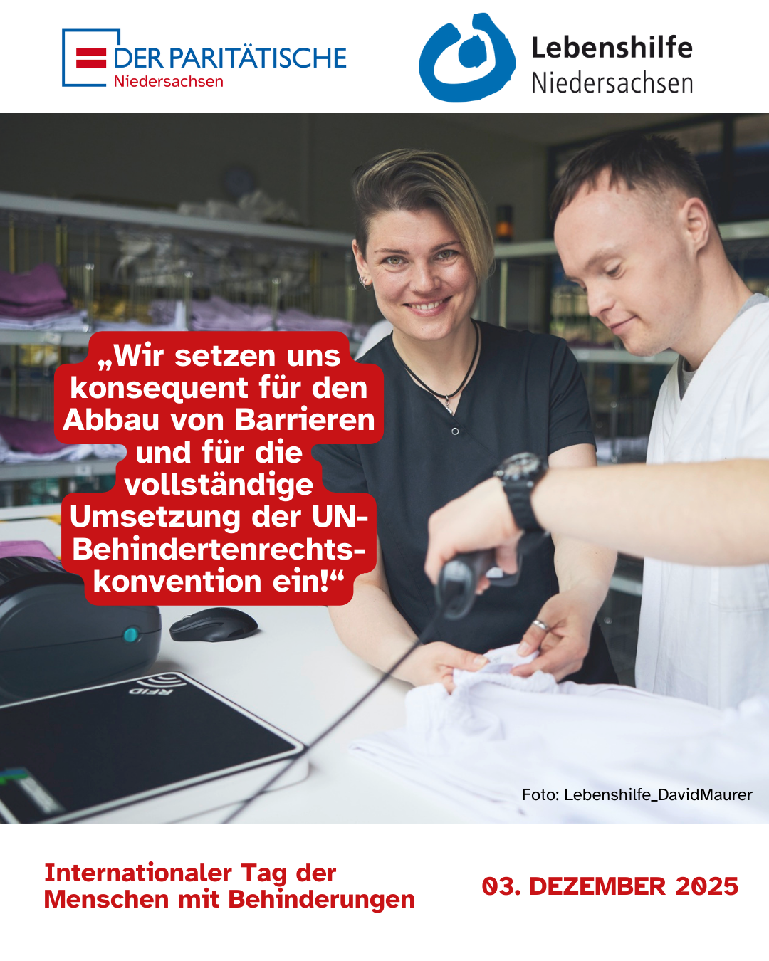 Zum Internationalen Tag der Menschen mit Behinderungen am 3. Dezember 2025 machen der Paritätische Niedersachsen und die Lebenshilfe Niedersachsen gemeinsam darauf aufmerksam, dass gleichberechtigte Teilhabe für Menschen mit Behinderungen in Niedersachsen weiterhin nicht selbstverständlich ist.