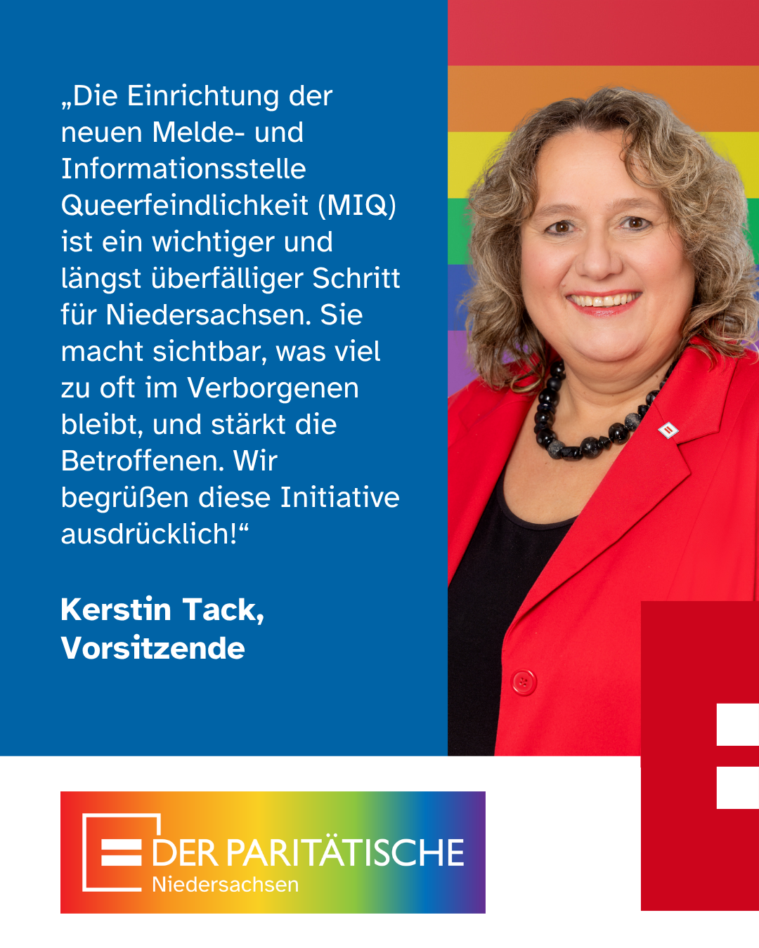 „Die Einrichtung der neuen Melde- und Informationsstelle Queerfeindlichkeit (MIQ) ist ein wichtiger und längst überfälliger Schritt für Niedersachsen. Sie macht sichtbar, was viel zu oft im Verborgenen bleibt, und stärkt die Betroffenen, indem sie ihnen Gehör verschafft und Unterstützung bietet. Als Paritätischer Niedersachsen begrüßen wir diese Initiative ausdrücklich – sie ist ein klares Signal für mehr Respekt, Schutz und gesellschaftlichen Zusammenhalt. Unser Ziel bleibt es, dass alle Menschen in Niedersachsen frei und sicher leben können, unabhängig von ihrer sexuellen Orientierung oder geschlechtlichen Identität.“