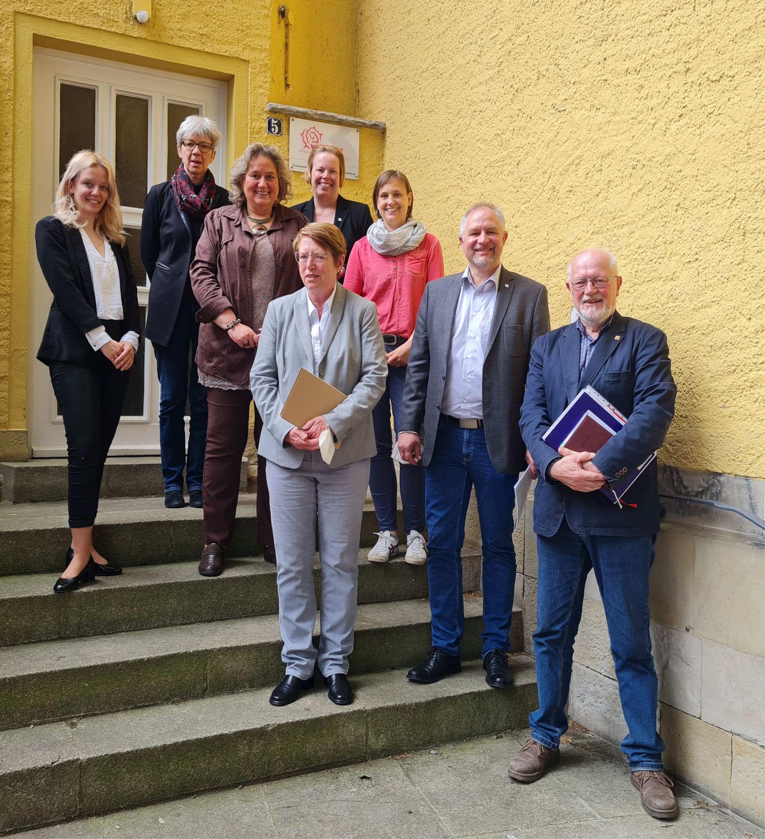 Hintere Reihe von links: Kerstin Tack (Vorstand Paritätischer Niedersachsen e.V.), Dr. Volker Bullwinkel (Regionalgeschäftsführer Paritätischer Niedersachsen Süd), Hartwig Kemmerer (ehrenamtlicher Vorstand Kwabsos e.V.), Anne Zellin (Referentin für Regionale Mitgliederförderung und Projektentwicklung Paritätischer Niedersachsen Süd). Vordere Reihe von links: Bozana Starcevic (stellvertretende Leitung Kwabsos e.V.), Tobias Knittel (zukünftiges Mitglied der Geschäftsführung), Anne Günther (Abteilungsleiterin Mitgliederbetreuung, Pflege, Gesundheit und Integration Paritätischer Niedersachsen e.V.), Thomas Tugendheim (Leitung Kwabsos e.V.).