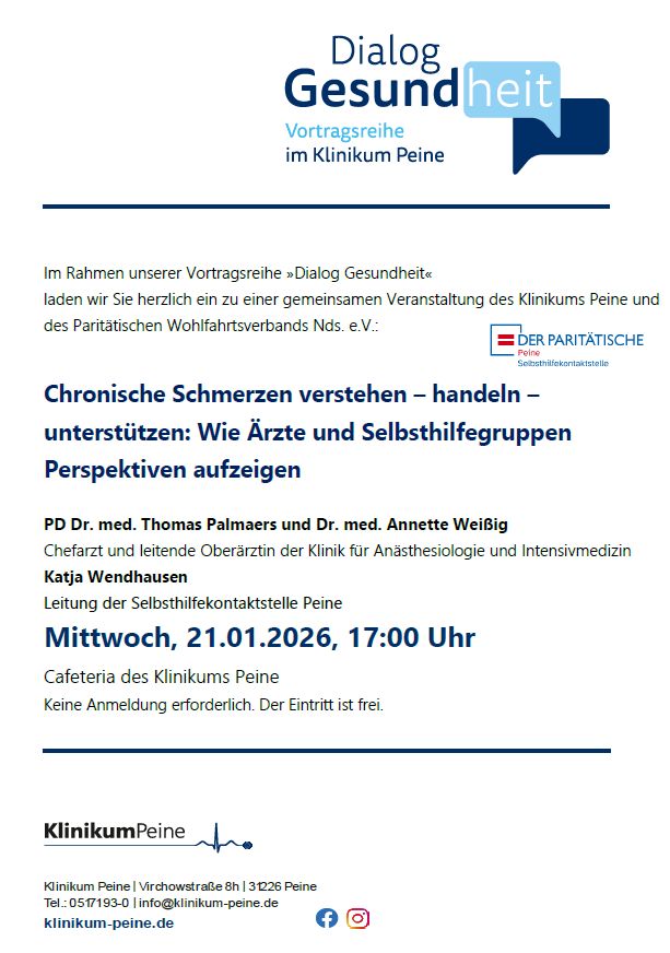 Im Rahmen der Vortragsreihe "Dialog Gesundheit" stellt sich die Selbsthilfekontaktstelle gemeinsam mit verschiedenen Selbsthilfegruppen am Mittwoch, dem 21.01.2026 um 17 Uhr im Klinikum Peine vor. Chronische Schmerzen stehen im Zentrum des Abends.