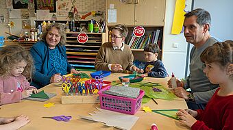 Kerstin Tack, Projektteilnehmerin Lisa und Olaf Lies beim Basteln in der Kita.