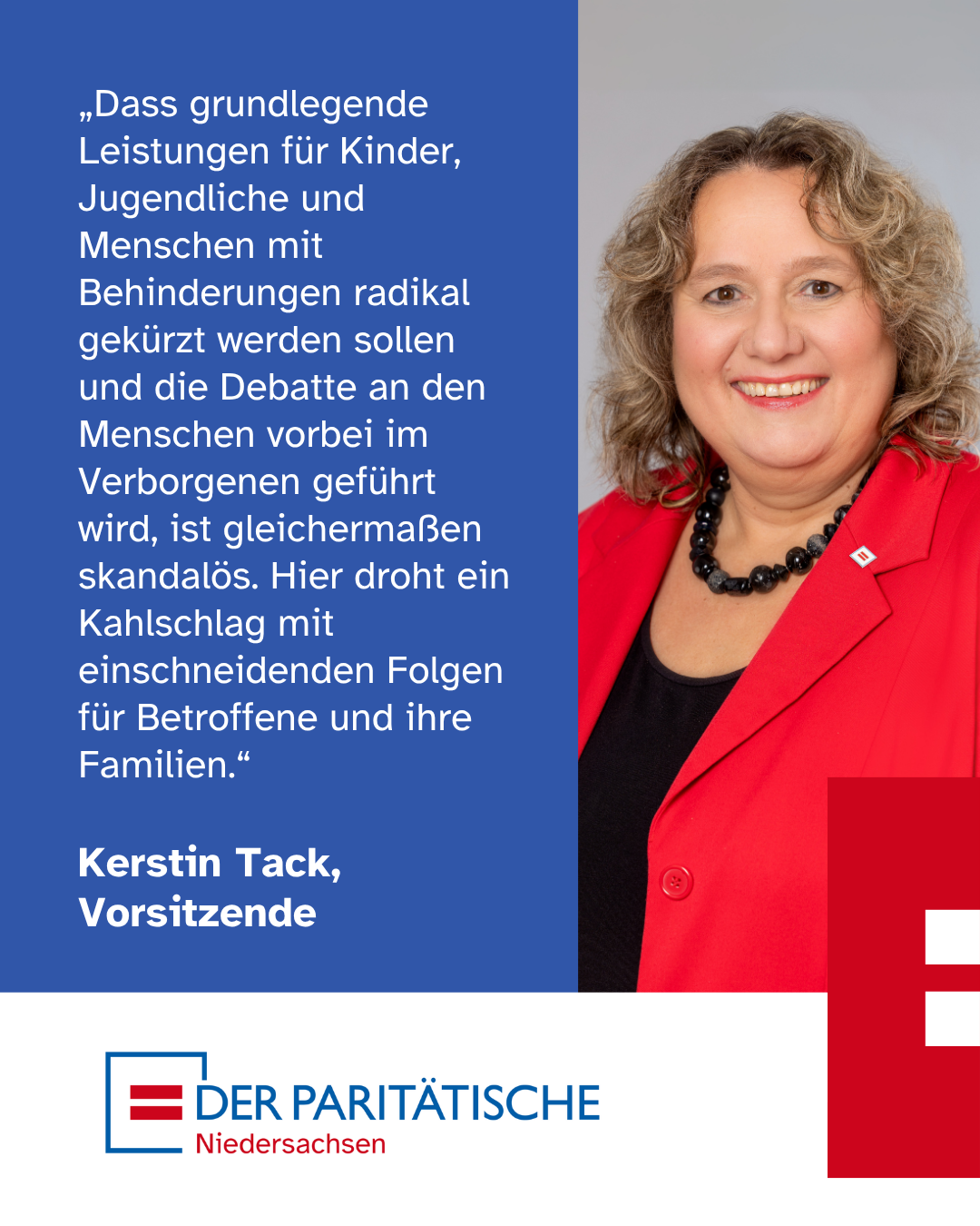 „Was hier unter dem harmlosen Titel ‚Effizienter Ressourceneinsatz’ verhandelt wird, ist ein Angriff auf Errungenschaften, die elementar für soziale Teilhabe sind und die über Jahrzehnte erkämpft wurden. Dass solche grundlegenden Leistungen für Kinder, Jugendliche und Menschen mit Behinderungen so radikal gekürzt werden sollen und die Debatte an den Menschen vorbei im Verborgenen geführt wird, ist gleichermaßen skandalös. Hier droht ein Kahlschlag bei Alltagshilfen, mit einschneidenden Folgen für Betroffene und ihre Familien", erklärt Kerstin Tack, Vorsitzende des Paritätischen Niedersachsen.