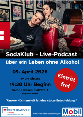 Die Selbsthilfekontaktstelle des Paritätischen Lüneburg lädt zum Live-Podcast von SodaKlub ein - einem Format über Alkohol, Sucht, Liebe und Unabhängigkeit. Der Podcast richtet sich an alle, die über Alkohol nachdenken. Dafür ist es egal, ob Du unter ihm leidest, ihn liebst, ihn hasst oder er Dein Leben einfach nicht mehr besser macht. Mika Döring und Mia Gatow berichten von ihren eigenen Erfahrungen, im Anschluss ist Raum für Austausch und Fragen.
